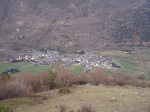Después, arrancamos el coche y decidimos que aún había luz y queríamos ver nieve de verdad, hacía un frío que pelaba pero aún no habíamos retozado en la nieve!!! Así que hicimos unos cuantos kilómetros más hasta parar en otro mirador, desde el que sacamos una foto a Esterri desde las «alturas»