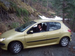 El camino era una mierda. Había baches más grandes que mis neumáticos, era como ir en montaña rusa a cámara lenta… y lo peor fue cuando vimos que venía un todoterreno de frente. Nos arrimamos a un lado, y cuando pasó por nuestro lado abrí la ventanilla porque parecía que iba a decirnos algo. Era una familia con niños, y el padre es el que iba conduciendo. Nos dijo «Uy, por ahí no podéis seguir, a kilómetro y medio la carretera está cubierta por la nieve). Así que, con los cojones de corbata, como quien dice, caminamos un poco más con el coche, y en donde vimos que había un poco más de anchura, nos decidimos a dar la vuelta. Hay que decir que justo antes de eso había un montón de nieve, donde mi 206 resbaló convenientemente, para dar un poco de intriga y emoción al asunto.