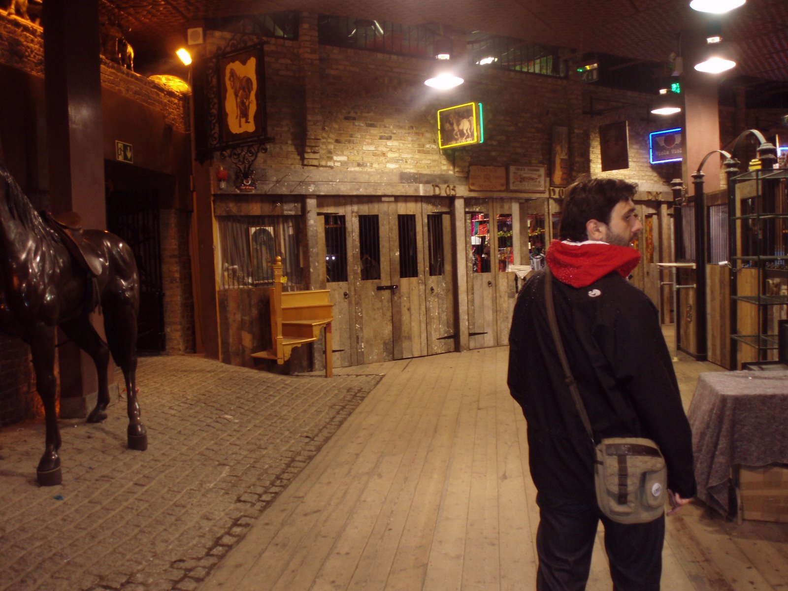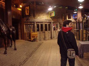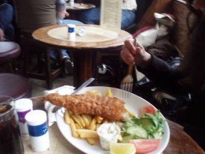 Ésta era la entrada que llevaba a lo que decía de los establos, por ahí había un montón de puestos de comida para llevar, e incluso en uno de comida china un chino nos saludó en español, jeje. La verdad es que era un laberinto de callecitas repletas de tiendas, muchísimas cosas para ver. Pero como digo, casi todo ropa y eso nos aburre un poco mirarlo. ;D Así que entramos, y aunque no es que fuera gente muy amable, finalmente comimos bastante bien, nos pedimos fish&chips (un plataco enorme, como se puede ver) y también alubias con tomate y queso, que estaban de vicio también. Compartimos los dos platos y los regamos con pepsi, con lo cual, quedamos bastante bien servidos, y no fue muy caro.