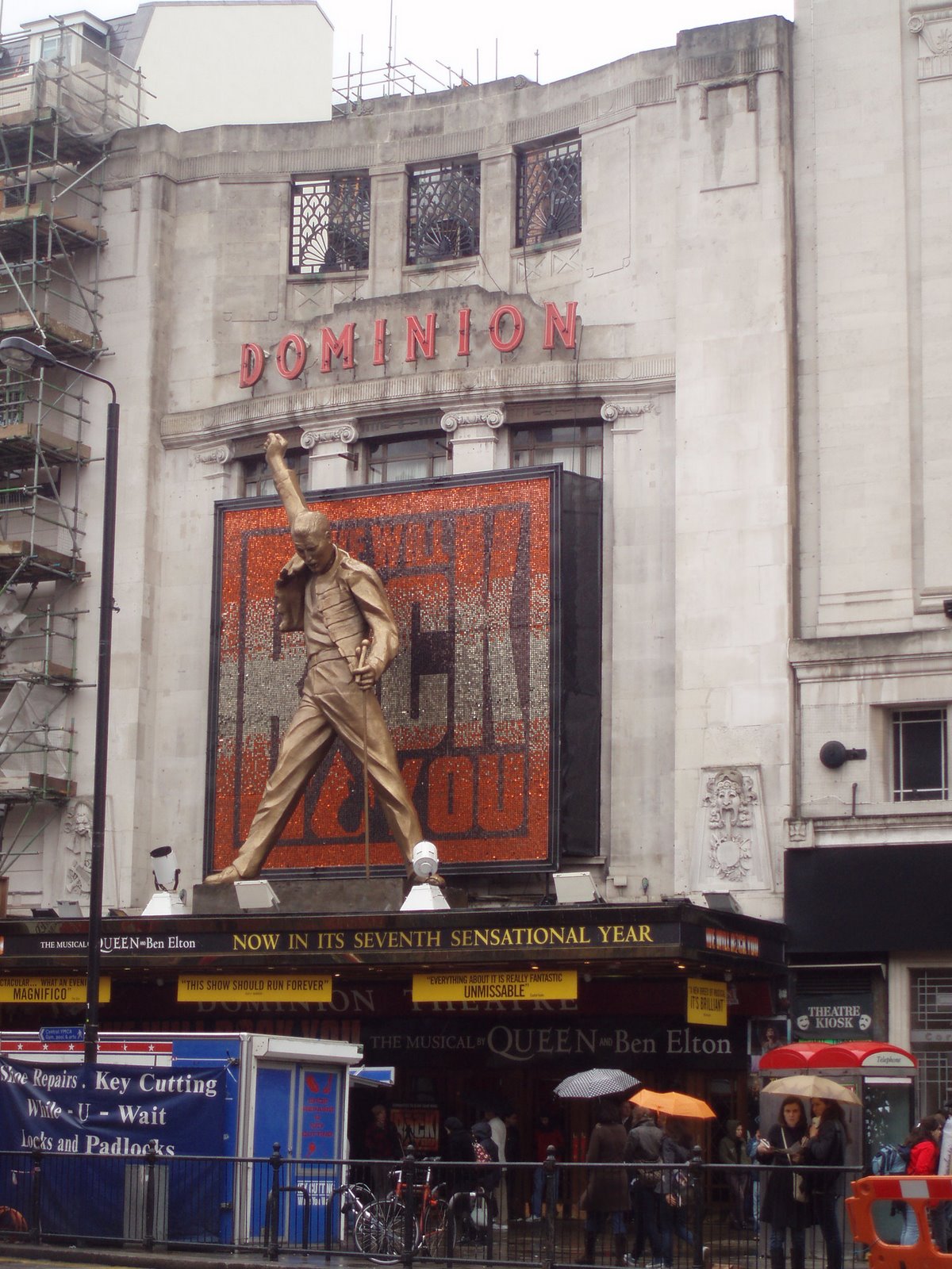 Seguidamente, volvimos a entrar en el metro, y nos fuimos hasta la parada que más cerca estaba de las tiendas frikis. Allí estuvimos dándole vueltas a las calles hasta que nos dimos cuenta de que nuestro mapa estaba mal!! Por el camino encontramos el teatro donde ponían el musical de Queen, que tenía una estatua de Freddie a la que sacamos un par de fotos.