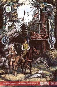 [Dije] “Parece interesante, pero aún así no os voy a dar Hielo y Fuego; es demasiado importante. Os digo lo que voy a hacer. Tengo una precuela de Hielo y Fuego, esta pequeña novela corta titulada El caballero errante que tiene lugar en el mismo universo, pero 100 años antes y con personajes diferentes. Os daré los derechos de esa, y veremos como lo hacéis.” Y el resto es historia, así que para qué hablar. Lo tomaron y lo desarrollaron, y tuvimos varios altibajos durante el proceso, pero han hecho un cómic bello.