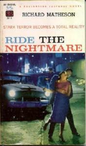 Ride the Nightmare. Esta novela se desvaneció virtualmente durante dos o tres décadas. Hubo una versión Alfred Hitchcock Presents de él que le gustó a mucha gente, pero que fracasó, para mí, en captar el singular terror escalofriante de la novela. Material familiar convertido en una obra maestra, si queréis una línea que resuman esta novela. Un hombre casado respetable con Pasado encuentra que su vida se convierte en un horror cuando una pareja de matones de su pasado aparecen e intentan chantajearlo para que los ayude con un nuevo trabajo. Hay una sensación particular de los cincuenta en este material que enriquece el modo en el que Matheson maneja el matrimonio en este. Le va bien la fecha porque habla de y para su era. Os diré la verdad – ya seáis un profesional establecido, o un principiante, si queréis tomar un curso de posgrado en escritura de novelas de suspense, memorizad este libro.