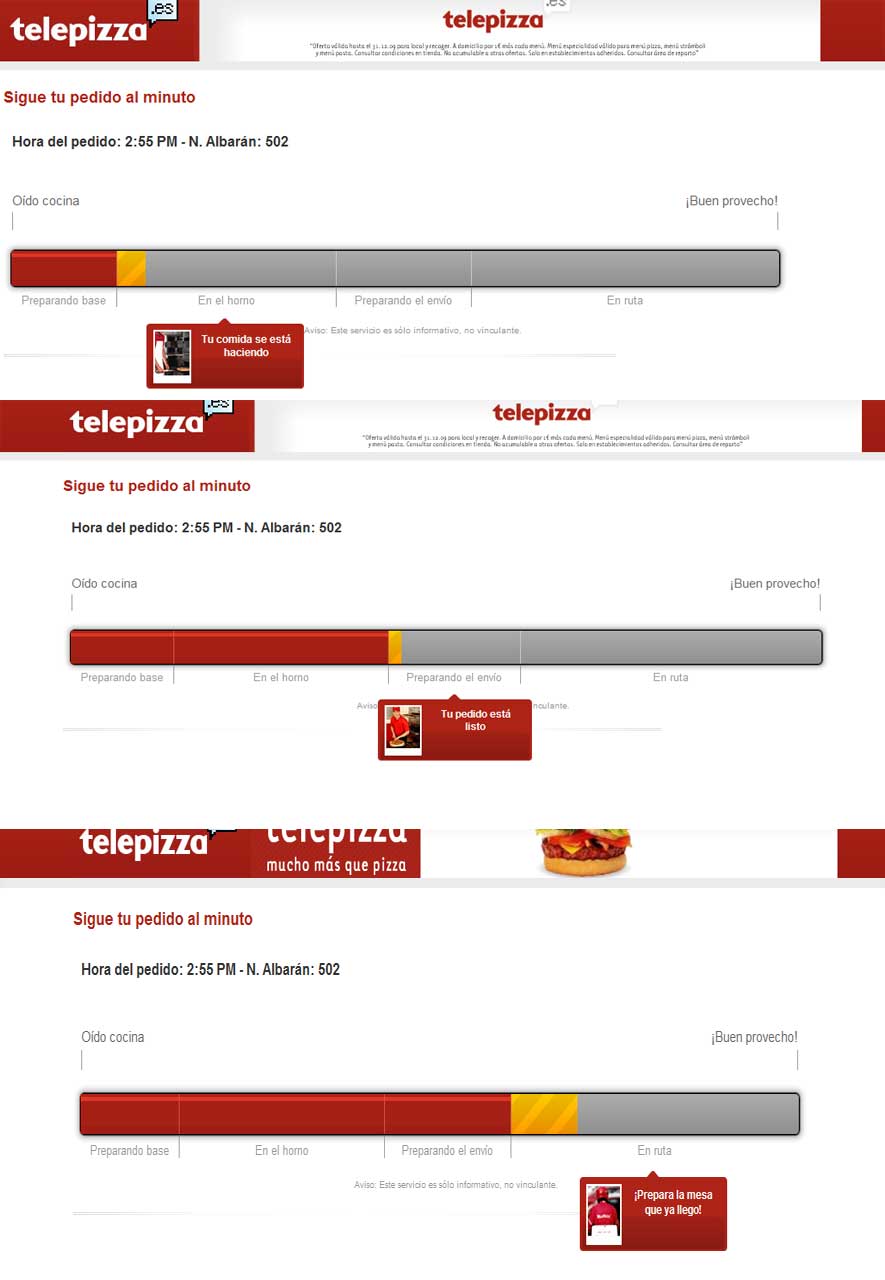 Hoy hemos comido una pizza de Telepizza, con champiñones, bacon, cebolla y demás. Están más buenas las de un sitio de por aquí, pero la verdad es que hemos optado por las primeras porque las de ese otro sitio no nos las traen a casa. Así que como ya lo habíamos hecho una vez, pedimos la pizza a través de su página web. Creo que calculan como media hora a partir de que termines de confeccionar el pedido, y la verdad es que llegaron diez minutos más tarde de lo que nos ponía, pero lo más curioso es que han incorporado una especie de seguimiento del pedido, cosa que no estaba la otra vez que pedimos (que sería en junio o así, ha pasado ya tiempo)