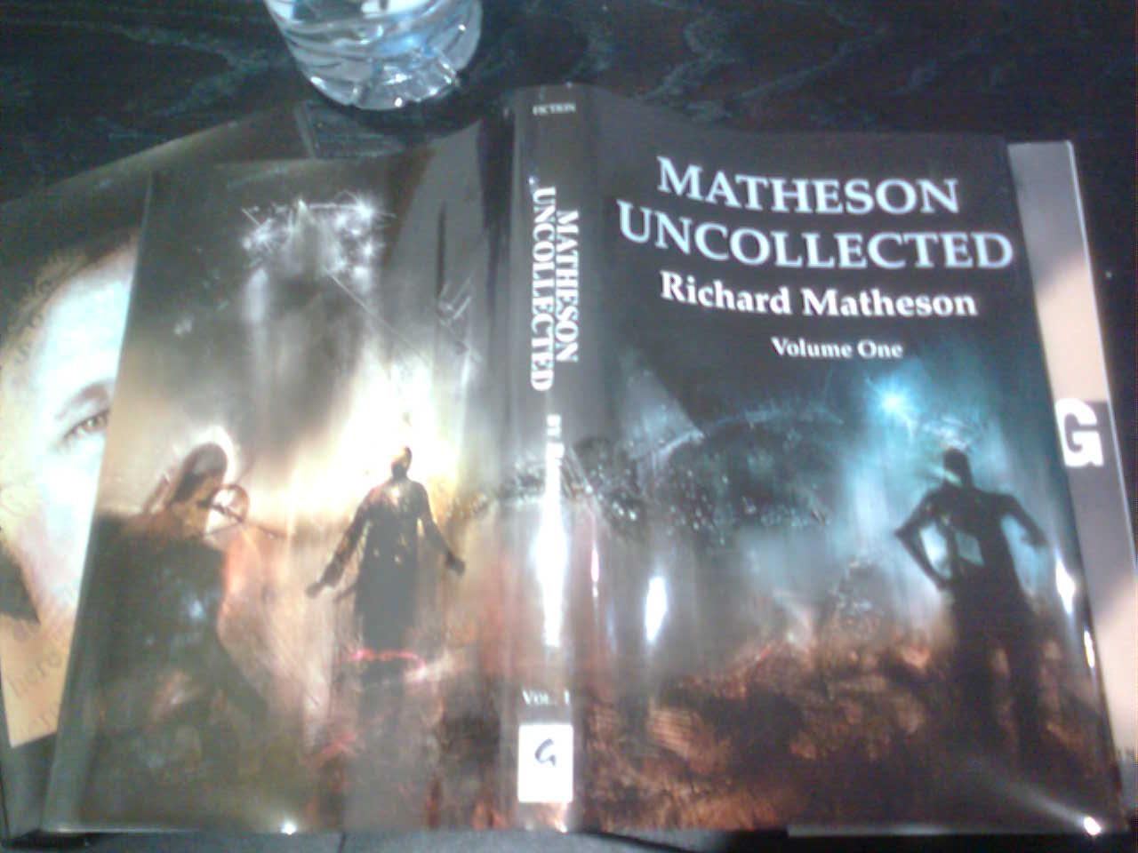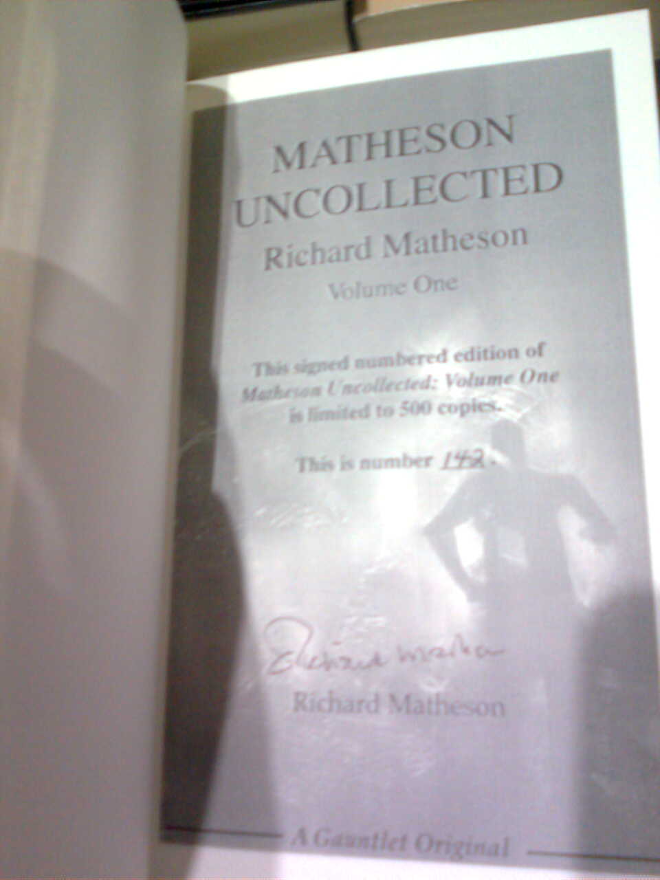 – RICHARD MATHESON UNCOLLECTED, de la ed. Gauntlet Press, con material inédito de Richard Matheson, el guión que escribió para Star Trek y relatos y algunas cosillas más. Mi copia es la 142 de 500. ^^ Pongo foto de la portada y la contraportada juntas, son muy bonitas.