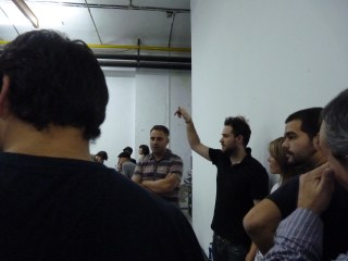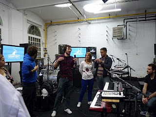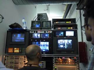 Después, nos dieron una vuelta por el sitio para enseñarnos cómo funciona la retransmisión, cámaras, etc. Al retransmitirse en directo por internet, la verdad es que me parecía muy interesante. Además, el concepto del concierto era el de Mendetz vs. Mendetz, que quiere decir que la gente desde casa iría eligiendo la cámara del componente del grupo que les interesara más, siendo una especie de duelo. Y aquí saqué unas cuantas fotillos.