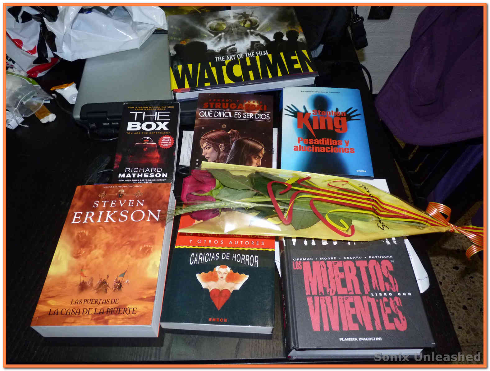 Los libros y rosa que nos llevamos a casa. La foto no le hace justicia a la rosa