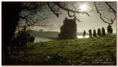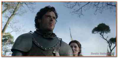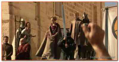 La siguiente escena tiene en cierto modo un paralelismo con la anterior. Vemos cómo Catelyn espera que Robb vuelva de la batalla. Y vuelve, pero con un prisionero muy valioso. Nada menos que el Matarreyes, pero claro, una vez más, no vemos ni un espadazo. Lo mismo podría ser que se han encontrado a Jaime borracho en una cuneta. xD