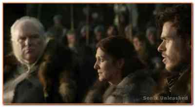 En la siguiente escena estamos de nuevo en los Gemelos. Catelyn vuelve con el resultado de sus negociaciones con Walder, y resulta ser la peor negociadora del Reino o algo así. Balance: tendrá que casar a Arya con uno de los hijos de Walder Frey, Robb tendrá que casarse con una de sus hijas, y tendrán que tomar a otro como escudero. Y bueno, él acepta todo a ciegas porque lo considera necesario, pero desde luego, que menuda consejera se ha ido a buscar teniendo a Catelyn a su lado durante la batalla. ¿Eso de acompañar a Robb en sus batallas por ahí, es de ser muy muy buena madre, o de todo lo contrario?