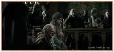 Y pasamos a una escena en el interior de los Gemelos, donde tooooda la familia de los Frey, con Walder a la cabeza, debate qué se debe hacer. Más bien, es el patriarca el que decide por todos. Deben ser el equivalente a red necks incestuosos que hay en los Siete Reinos. Desde luego, el casting para Walder Frey está genialmente hecho, el tío consigue ser todo lo áspero y desagradable que requiere el personaje. El tío no para de echarle cosas en cara a Catelyn y a su familia, se ve que con todo lo áspero que es, tiene su corazoncito y se ofende fácilmente, o algo.