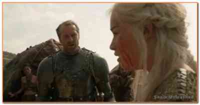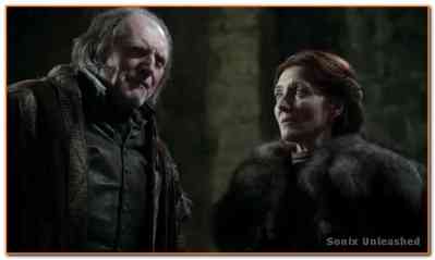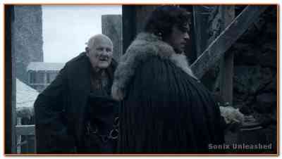 De vuelta en el Muro de nuevo, vemos una escena bastante chula entre Jon y Aemon, donde este último le sondea porque ya sabe que Sam le ha informado de las noticias. Y entonces le hablar largo y tendido de lo que supone haber hecho el juramento de la Guardia, de lo que supone haber hecho unos votos que le atan al Muro de por vida, y de cómo su vida pasada, su familia y todo lo que quería antes, han de quedar atrás. Y revela cual fue su familia y su identidad. Y es que resulta que el viejo Maestre es, nada más y nada menos, que Aemon Targaryen, que renunció a la corona hace muchísimo tiempo.