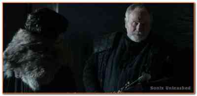 Y pasamos a una escena bastante emotiva entre el Lord Comandante Mormont y Jon Nieve. Mormont ha decidido hacer de Jon su heredero y legarle la espada que ha ido pasando en su familia de padres a hijos… cambiando la cabecita de oso de la empuñadura por la de un lobo. Y tiene toda la pinta de que han utilizado el mismo modelo que tienen a la venta en Varlyrian Steel, del cual no me gusta mucho precisamente eso, la cabecita de lobo. En una escena en la que el Comandante le agradece que le haya salvado la vida y le da la espada, también le informa de que su máximo enemigo en el Muro (Alliser Thorne) ha partido rumbo a Desembarco del Rey a informar a la Corte de lo que está pasando con los muertos.