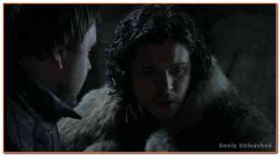 Luego pasamos a una escena en la que Jon va a donde están sus compañeros. Se ve que con su hazaña de matar a los muertos y salvar la vida de Mormont, se ha convertido en una especie de celebridad. Allí, ve a Sam cabizbajo por un motivo. No es otro que las noticias que vienen del sur, sobre Robb que marcha con un ejército hacia el sur. No podía decírselo pero se lo dice, y claro, Jon opina que debería estar con su hermano en un momento así.