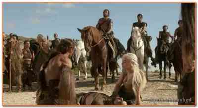 Salto a otra escena con Dany donde vemos ya a un Khal Drogo moribundo, que morirá esa noche. Ante eso, Daenerys (que la lleva cagando mucho y bien desde hace mucho tiempo), decide que Mirri lleve a cabo magia de sangre para salvar a Drogo, magia que pintan como bastante chunga y para la cual Mirri debe quedarse a solas en la tienda con Drogo. Ante eso, los dothrakis se rebelan. Hay una lucha entre Jorah y uno de los guerreros mientras suenan de fondo los irritantes cánticos de Mirri con un extraño eco, y el rebelde acaba mordiendo el polvo. Dany no se encuentra nada bien y además está bastante embarazada y a punto de dar a luz, y ahí los dejamos, a Jorah llevándola en brazos a dentro de la tienda para que Mirri les ayude en el parto, y a Dany a punto de dar a luz a su hijo.