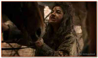 En la siguiente escena vemos a un Khal Drogo que ya se cae del caballo, y recordemos lo importante que es para un señor de los caballos el poder cabalgar (sin querer me he acordado del personaje de Ron Perlman en Sons of Anarchy xD). Como resultado de su herida en el pecho, parece que tiene una infección brutal y deben detenerse porque está delirando con la fiebre. Uno de los hombres del khalasar se rebela y no está nada conforme con el hecho de que su khal esté enfermo, pero Daenerys consigue convencerlos a todos de que deben detenerse. Es más, decide seguir recurriendo a la prisionera Mirri para curar a Drogo.