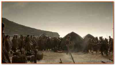 En la escena siguiente ya ha empezado la batalla, y ha pillado a Tyrion durmiendo la mona. Hummmm, esto no es exactamente como lo recordaba… y aunque mola mucho eso de que los salvajes vitoreen a Tyrion gritando «Half man, half man!!» me hubiera gustado ver algo de la batalla, y que Tyrion tuviese algo más que la ridícula función de desmayarse antes de empezar. ¬¬ Vamos, que aunque no se gastasen una pasta indecente en hacer escenas de batallas, me gustaría que en este caso fuesen fieles al libro, donde Tyrion sí lucha, y además de manera sorprendentemente valiente. Total decepción en este aspecto.