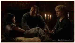 Y en una escena en la que hay una reunión Lannister, con Tywin, Tyrion y demás en el campamento Lannister, informan al Gnomo de que estará en la vanguardia de la batalla del día siguiente con sus salvajes. Después de eso, Tyrion va a su tienda y allí conocemos a Shae, a la que sabemos que le espera una larga historia a partir de ahí. Resulta que se la ha llevado Bronn para que le haga compañía. Allí Tyrion le establece unos términos muy claros para lo que será su relación.