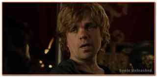 Y pasamos a una escena que empieza siendo bastante banal en la que hay confesiones a tres bandas entre Shae, Bronn y Tyrion, con un juego de «verdad o trago», o algo así. Finalmente, Tyrion, ya bastante borracho, acaba contando con detalle la historia de su primer amor, Tysha, la chica con la que perdió la virginidad y terminó siendo una puta. Y todo ello fruto de una broma cruel orquestada por Jaime, su hermano, y Tywin. De esto sabremos más más adelante, en otra temporada posiblemente.