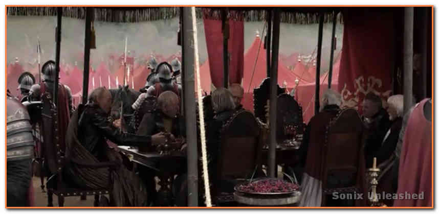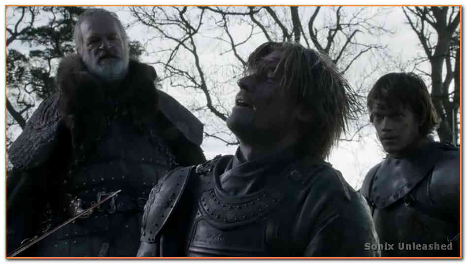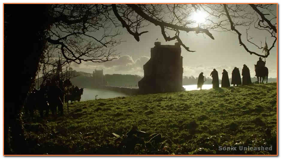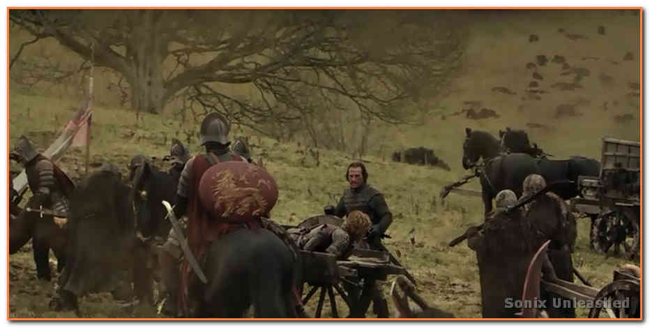 La siguiente escena tiene en cierto modo un paralelismo con la anterior. Vemos cómo Catelyn espera que Robb vuelva de la batalla. Y vuelve, pero con un prisionero muy valioso. Nada menos que el Matarreyes, pero claro, una vez más, no vemos ni un espadazo. Lo mismo podría ser que se han encontrado a Jaime borracho en una cuneta. xD