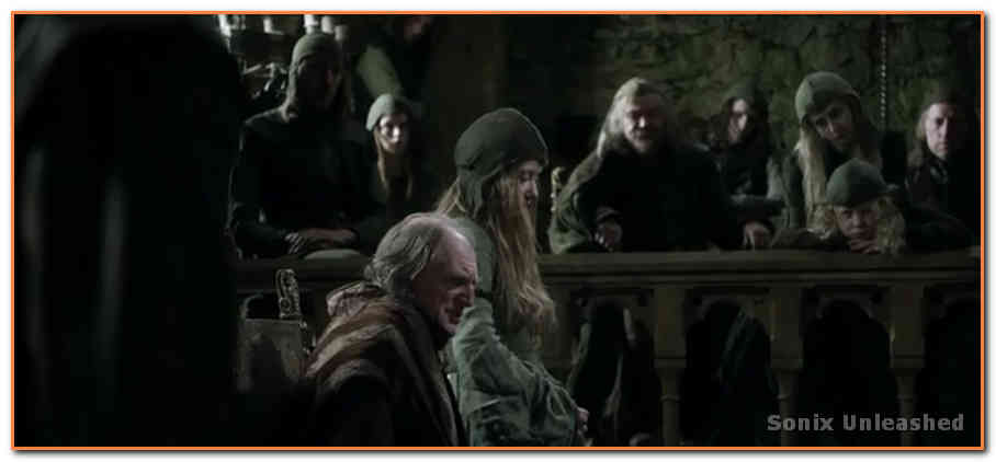 Y pasamos a una escena en el interior de los Gemelos, donde tooooda la familia de los Frey, con Walder a la cabeza, debate qué se debe hacer. Más bien, es el patriarca el que decide por todos. Deben ser el equivalente a red necks incestuosos que hay en los Siete Reinos. Desde luego, el casting para Walder Frey está genialmente hecho, el tío consigue ser todo lo áspero y desagradable que requiere el personaje. El tío no para de echarle cosas en cara a Catelyn y a su familia, se ve que con todo lo áspero que es, tiene su corazoncito y se ofende fácilmente, o algo.