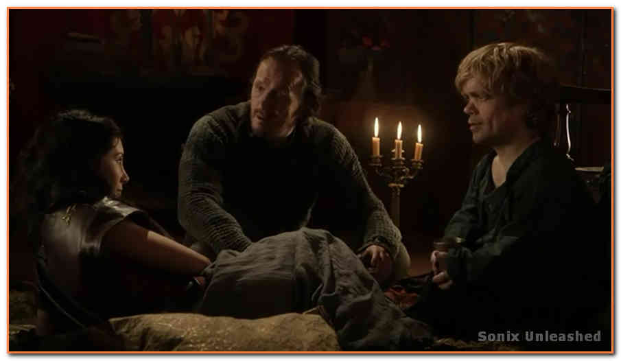 Y pasamos a una escena que empieza siendo bastante banal en la que hay confesiones a tres bandas entre Shae, Bronn y Tyrion, con un juego de «verdad o trago», o algo así. Finalmente, Tyrion, ya bastante borracho, acaba contando con detalle la historia de su primer amor, Tysha, la chica con la que perdió la virginidad y terminó siendo una puta. Y todo ello fruto de una broma cruel orquestada por Jaime, su hermano, y Tywin. De esto sabremos más más adelante, en otra temporada posiblemente.