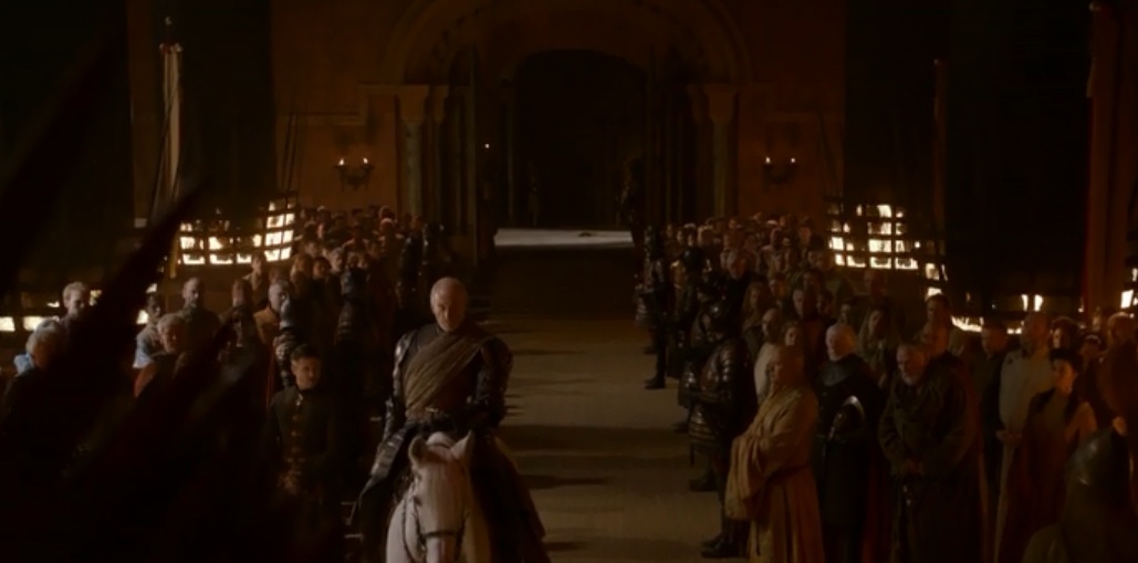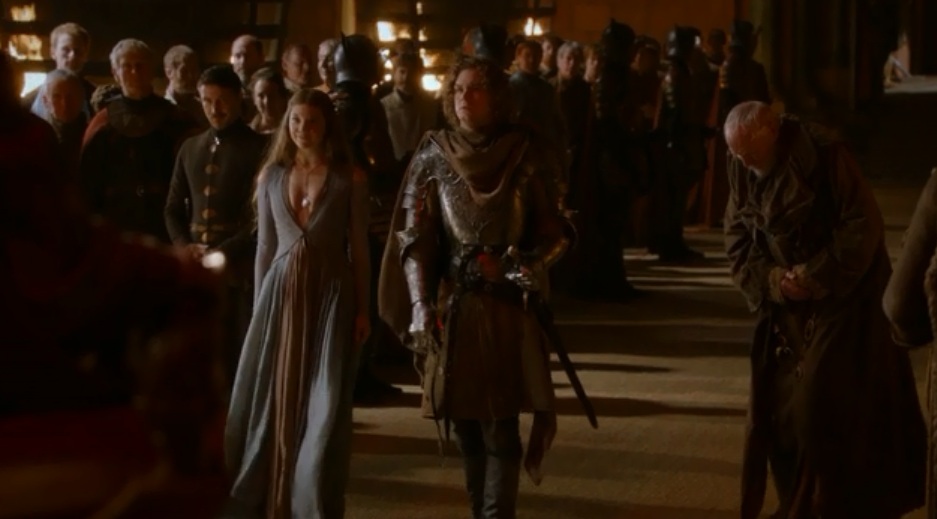 En la siguiente escena, muy política, Joffrey está repartiendo premios por la victoria de la batalla de Blackwater. Así que para decirlo rápido y resumido: le regala Harrenhal a Meñique, nombra Mano a su abuelo Tywin, y en un giro de la situación, acepta casarse con Margaery Tyrell, dejando de lado a Sansa con el apoyo de su consejo y en especial de su madre Cersei (que por fin ve el cielo abierto al librarse de Sansa como potencial nuera).