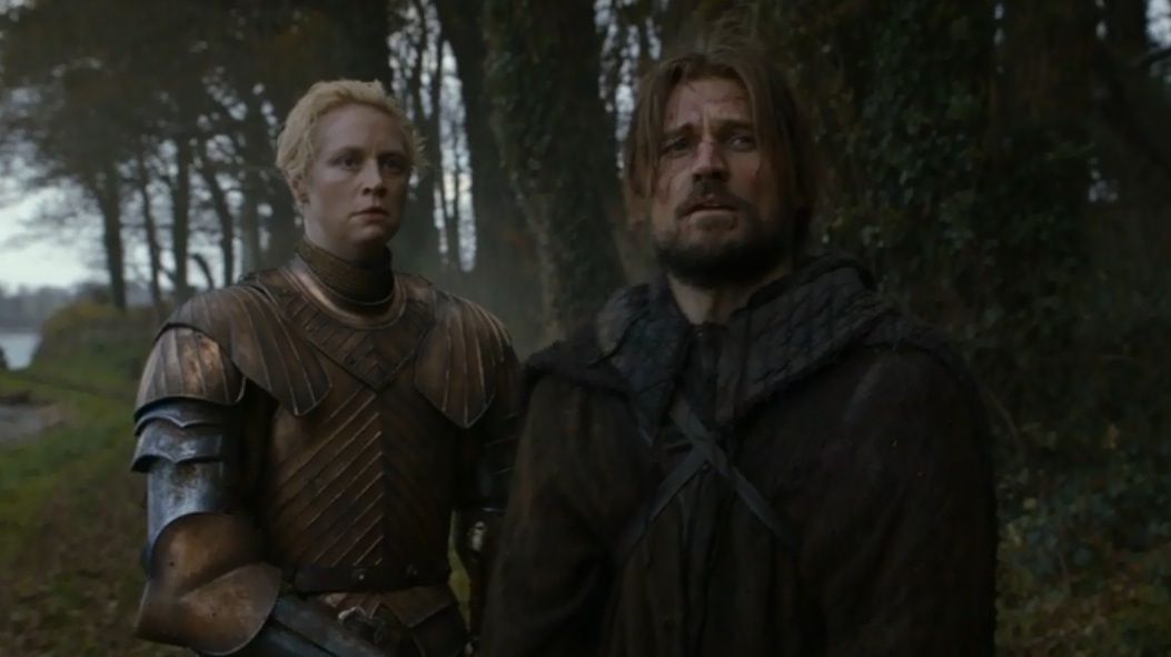 Y volviendo por fin a la extraña pareja, vemos que Jaime y Brienne siguen su viaje juntos, y deben fingir que él es un delincuente común para que los soldados no los detengan. Hay una escena bastante chula donde vemos a Brienne luchar con la espada, y a Jaime poner cara de asombro y de admiración. Al final, el casting de Brienne ha resultado estar muy bien hecho, e incluso la actriz ha conseguido que el personaje parezca igual que obtuso que en los libros.