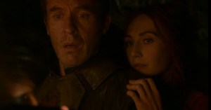 Stannis está la hostia de cabreado después de haber tenido que retirarse en la batalla del capítulo anterior, y está a punto de estrangular a Melisandre (¡mierda, por qué poco no lo hace!), pero esta consigue convencerlo. Como siempre, un poco de restriegue, algún truco barato y vagas promesas pueden convencer a Stannis de que conseguirá algo con la guerra que ha comenzado contra todos los demás.