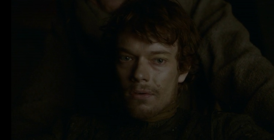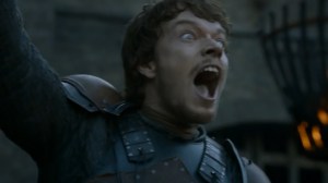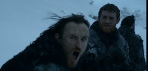 Theon está en Invernalia, bajo asedio y sin noticias de su padre. Está desesperado y es normal. Así que la perspectiva de huir en la oscuridad y pedir refugio en casa de su padre, como le propone Luwin, no le parece algo digno que pueda hacer. Tampoco se lo parece el hecho de unirse a la Guardia de la Noche, así que decide quedarse y luchar. Cuando sale a arengar a sus hombres, suelta un discurso muy motivador y tremendo… pero viene Dagmer y le pega un mamporrazo. Pobre Theon, acaba la escena inconsciente, con una capucha en la cabeza. Y en el fondo ya digo, en la serie Alfie Allen ha hecho un trabajo tan bueno esta temporada, que ha permitido apreciar los muchos tonos de gris que tiene el personaje de Theon, aquí me ha resultado más fácil entenderlo y entender sus motivos que en los libros.