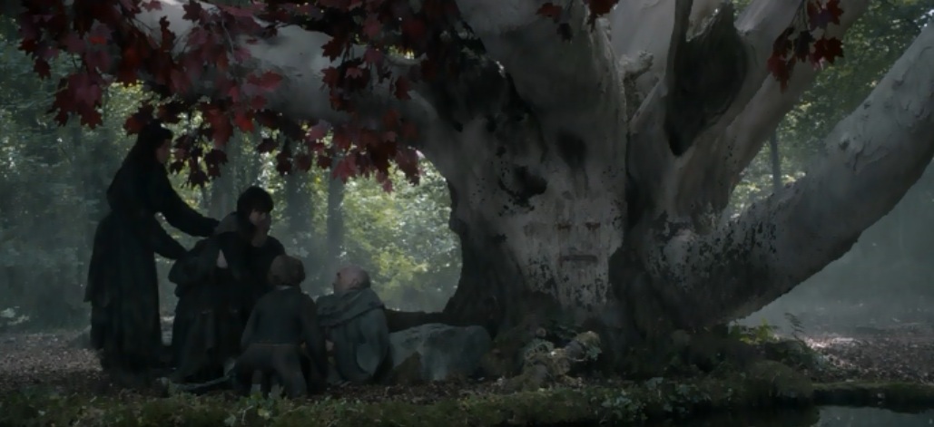 Y escena triste y de despedida. Después de que haya pasado en Invernalia lo que pasó, Luwin se encuentra agonizando bajo el árbol corazón del bosque de los dioses. Pero en esto que Brann, Rickon y sus carabinas Hodor y Osha vuelven a Invernalia, justo para despedirse de él. Él les dice que se vayan y finalmente, le pide a Osha una eutanasia por la vía rápida. Adiós, Luwin, también te echaremos de menos.