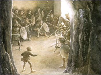 Mientras cantabasn, el hobbit sintió dentro de él el amor de las cosas hermosas hechas a mano con ingenio y magia; un amor fiero y celoso, el deso de los corazones de los enanos. Entonces algo de los Tuk renació en él: deseó salir y ver las montañas enormes, y oír los pinos y las cascadas, y explorar las cavernas, y llevar una espada en vez de un bastón.
