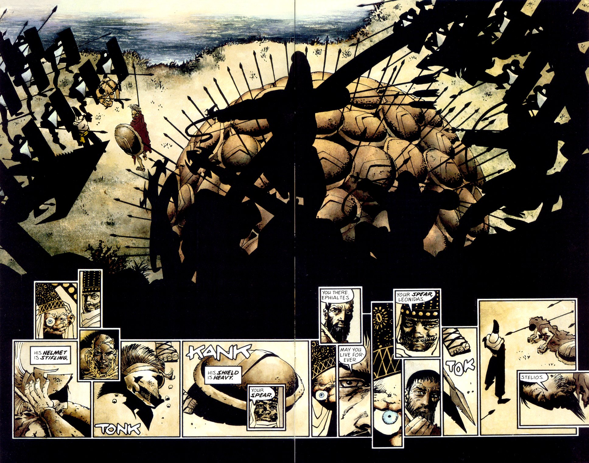 Yo creo que es lo último de Frank Miller que me encantó, antes de que el Miller de ‘El regreso del Caballero Oscuro’, ‘Batman. Año uno’, su Daredevil o ‘Ronin’ desapareciera para hacer bodrios como el ‘All Star Batman y Robin’ (pasable por el dibujo de Jim Lee, pero no dejas de preguntarte qué demonios estás leyendo…) o, sobre todo, ‘Holy Terror’, lo peor que he leído en años (y con menos texto incluso que ‘300’, aviso por si acaso cae en tus manos…). La primera parte de ‘300’ me parece sencillamente memorable. Luego no baja mucho, pero el arranque es insuperable. Y la película me parece una buena adaptación, original en su forma de entender el salto de la viñeta al cine y manteniendo el nivel de entretenimiento. Me gustan las dos, novela gráfica y película, desde luego…