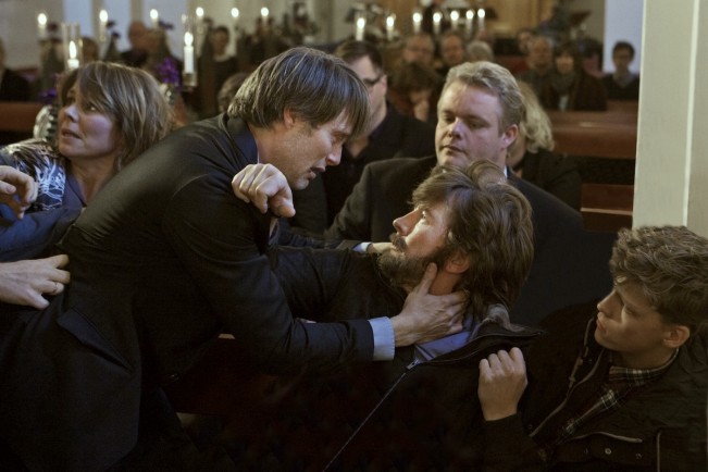 Lo que pasa a partir de ahí es la historia de cómo todo el entorno de Lucas (amigos, conocidos, compañeros de trabajo…) cree que él es un pervertido y una especie de depredador sexual. No voy a contar más, porque lo mejor es ver la película y observar cómo el círculo se va cerrando a su alrededor, cómo las personas que hasta el momento del incidente eran de su confianza le vuelven la espalda y le aíslan. La desconfianza, y el hecho de que de repente Lucas se encuentre aislado y pierda el trato de todo su entorno, resultan muy duros de ver. JAGTEN045050-651x434Más que nada, porque algo así podría pasar perfectamente. En la película podemos apreciar lo verosímil que es la historia de principio a fin, y es fácil trasladarlo a otros entornos menos específicos, e incluso a otras mentiras menos controvertidas. Esto trata de lo que es correcto, de la fuerza de la masa frente a un individuo que se ve superado ante una injusticia y no tiene forma de defenderse. En resumen, trata del poder de la mentira.
