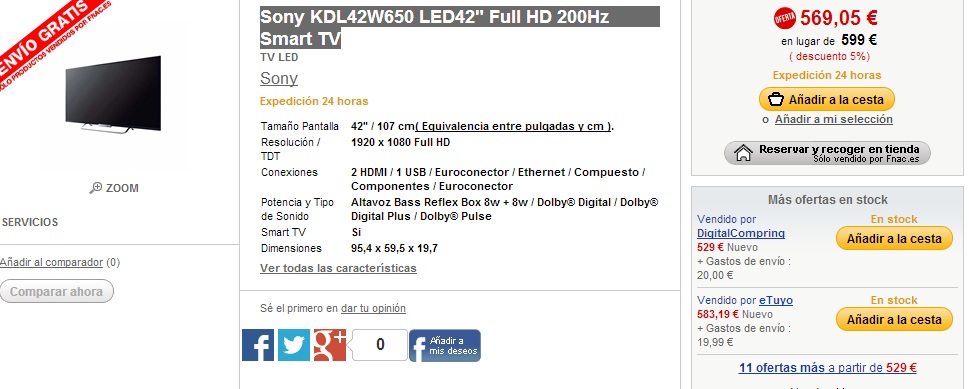 – Sony KDL42W650 LED42″ Full HD 200Hz Smart TV: 569,05 €