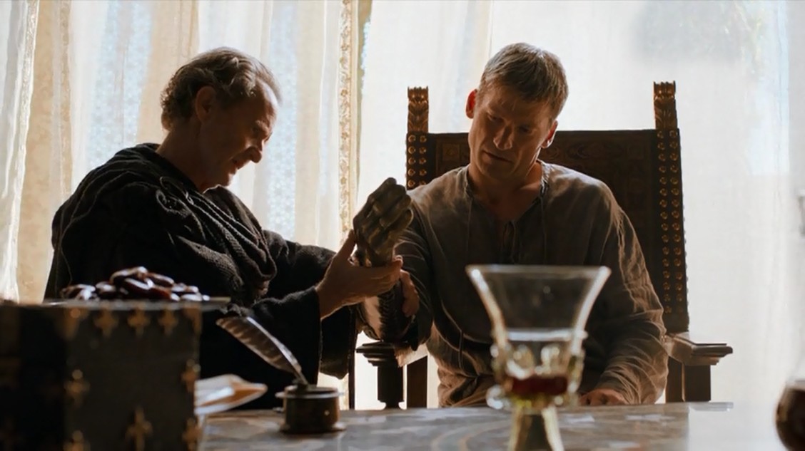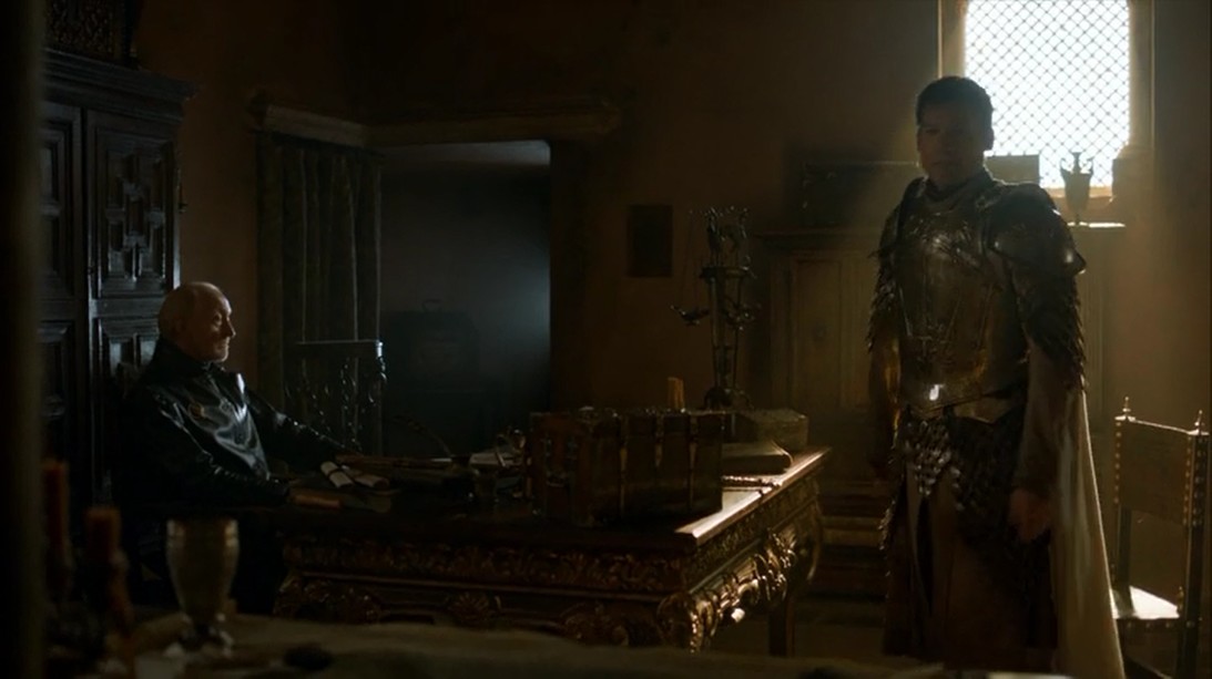 Tras la tradicional melodía (que todos tarareamos, confesémoslo… yo incluso podría confesar que la he maullado un montón de veces xD), veremos de nuevo a Tywin con su hijo Jaime. Recordemos que de lo último que vimos en la anterior temporada, una de las escenas importantes era la de Jaime pudiendo volver por fin con su familia, a Desembarco del Rey. En este primer capítulo estamos viendo cómo reengancha con su vida de antes, pero sin todos los miembros que tenía antes. La cuestión en esta escena es que una de las espadas que se han forjado a partir de Hielo es para el ahora manco hijo mayor de los Lannister. La reunión acaba más bien mal, ya que Tywin tiene unos planes para Jaime que este no acepta. Básicamente quería enviarlo a Roca Casterly, ya que ahora no sirve para ser Guardia y proteger al rey, su sobrino.