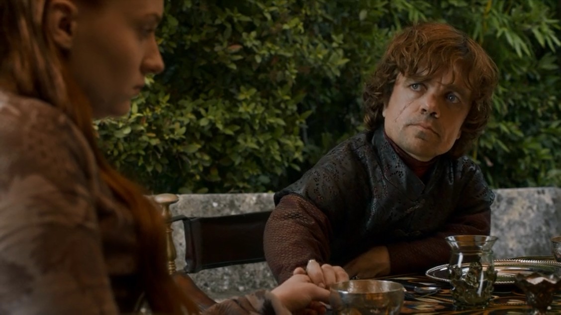 De vuelta en Desembarco del Rey, tenemos una escena entre Tyrion, Sansa… y la omipresente Shae. Sansa está deprimida y dice que no come por lo que le ocurrió a su hermano. Normal. Tyrion intenta darle ánimos como buenamente puede, sin mucho éxito. Así que Sansa le odia por tener la familia que tiene, y Shae le odia porque está celosísima. Pobre Tyrion, poco puede hacer él para compensar a su mujer por la muerte de gran parte de los Stark.