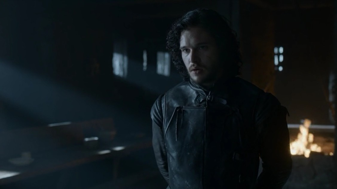 Jon Nieve está de vuelta en el Castillo Negro, y aunque sigue teniendo la cara de haba de siempre, habla más de lo habitual. Sam le escucha pacientemente. En la siguiente escena, un tribunal representativo de la Guardia de la Noche le juzga por lo que hizo más allá del Muro, por matar a Qhorin. Le quieren decapitar por todo lo que hizo, por acostarse con una salvaje, por traicionarles… Pero él revela información que puede ser muy importante para ellos, y deciden perdonarle la vida.