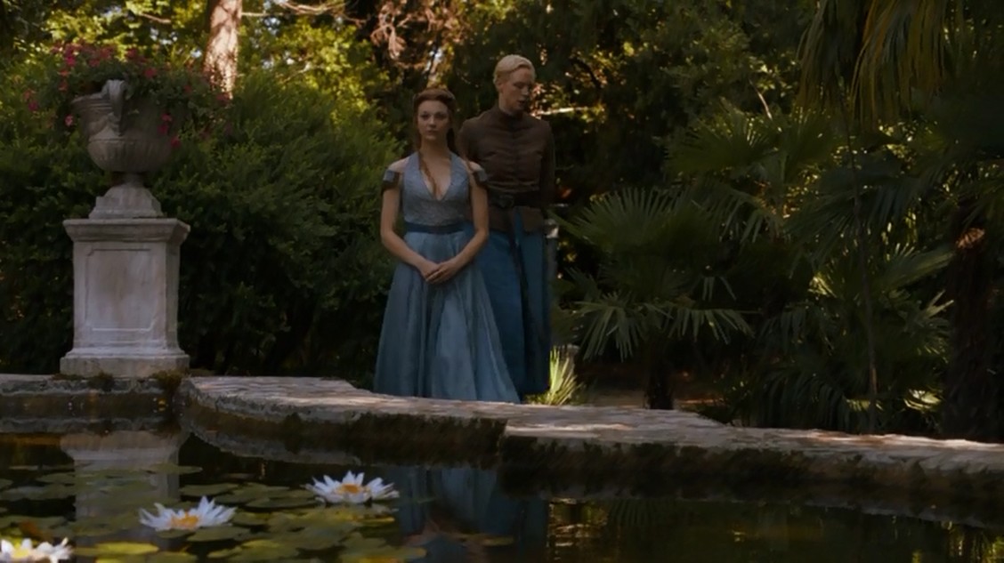 En la siguiente escena volvemos a ver a OlennaTyrell y su nieta Margaery, que están arreglando los preparativos para la boda  (joyas y cosas así). Les interrumpe Brienne de Tarth, que quiere hablar con Margaery. Pero para qué negarlo, lo mejor de la escena es su final y la transición a la siguiente, que sería el de la foto que viene a continuación… ¡genial!