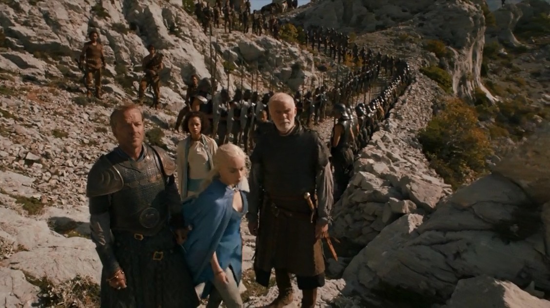 Volviendo a Daenerys, vemos que su ejército está en marcha. También vemos nuevas muestras del jueguecito raro que tiene con Daario, que la corteja un poco a lo tonto, igual de a lo tonto que ella se niega a hacerle caso… Sí, pero no, pero sí, y así pasan algunos minutos. Después de esta tontería de cortejo, vemos cómo su ejército llega a uno de los cadáveres que hay colgados hasta llegar a Meereen. Ella no se deja amedrentar por eso, así que continúan a pesar de los esclavos que, al parecer, encontrarán cada milla.