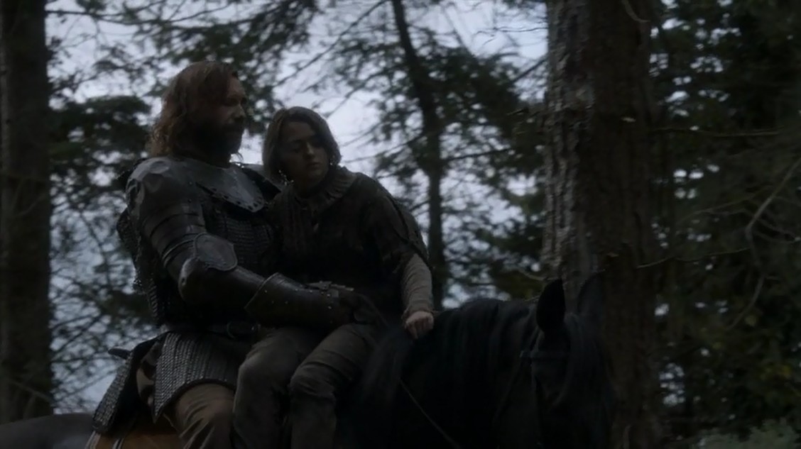 Y el Perro y Arya van peleándose montados en el mismo caballo. Según cuenta, el Perro tiene planes de vender Arya a su tía Lisa Arryn, del Valle. Hacen una parada, y Arya reconoce a uno de los que la capturó y la llevó a Harrenhaal. Resulta que tiene su espada, Aguja. Así que después de una breve conversación entre Polliver (que así se llama el cabrón) y el Perro, donde el primero ofrece al segundo acompañarles y hacer pillaje por todo Poniente, y el segundo dice que no sin demasiada educación. Está bien ver el intercambio y saber o intuir que va a acabar a espadazo limpio. Así que, ¡segunda pelea del capítulo! La primera, claro, fue la de Oberyn, no tan bestia como esta. Y termina el capítulo, dejándonos con ganas de más hasta la semana que viene.