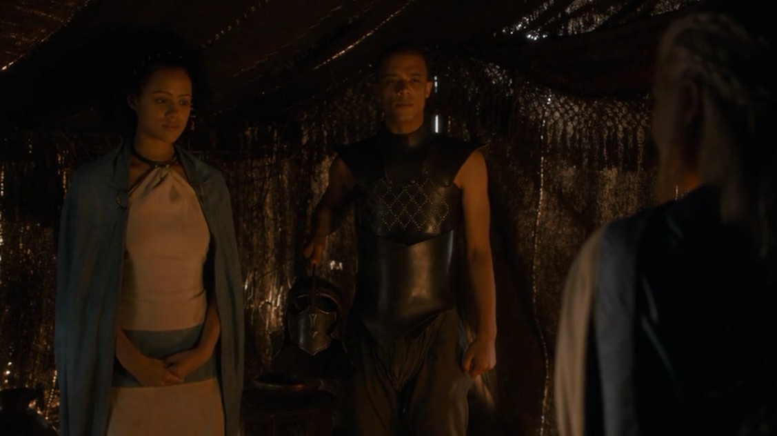 El capítulo comienza en el exterior de Meereen, donde vemos cómo Missandrei enseña a Gusano Gris la Lengua Común. También hablan sobre sus respectivos pasados, Missandrei le habla a él de su vida antes de ser esclava e intenta averiguar algo más sobre el pasado de Gusano Gris, pero no lo consigue porque el chico es reacio a contar nada. Les interrumpe Daenerys, que viene a avisarles de que van a entrar en acción en la ciudad.