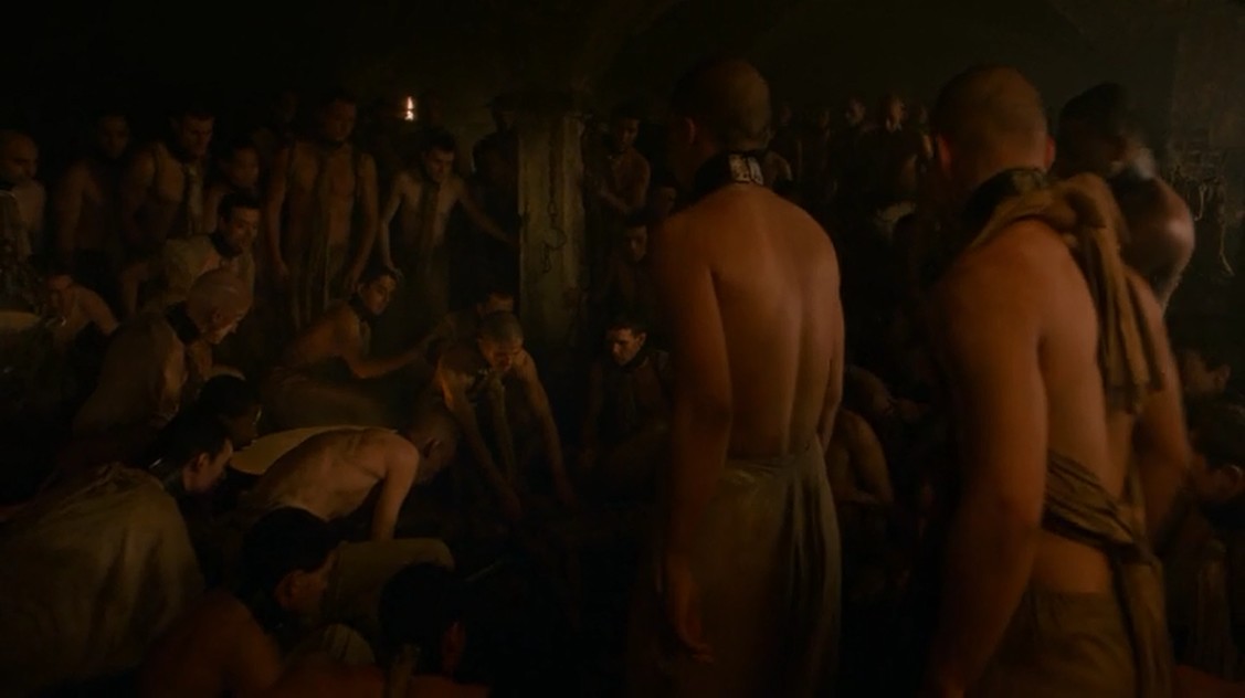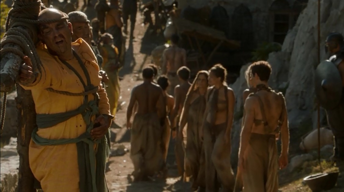 Un grupo grande de Inmaculados se cuela dentro de los muros y contacta con los esclavos. Una vez con ellos, les convencen, les entregan armas y les incitan a rebelarse, para pasar a ser «libres» como ellos lo son ahora. La cosa resulta ser un éxito, y los esclavos se lanzan a la calle para asesinar a sus amos. Lo siguiente es otro baño de multitudes de Daenerys, con más esclavos llamándole «Mhysa» (que recordemos que significa «madre»). Para vengar la muerte de los niños que los señores de Meereen colgaron en postes para disuadirla de acercarse a la ciudad, decide practicar el «ojo por ojo» y colgar de cruces a 163 de los señores de la ciudad.