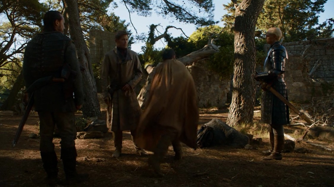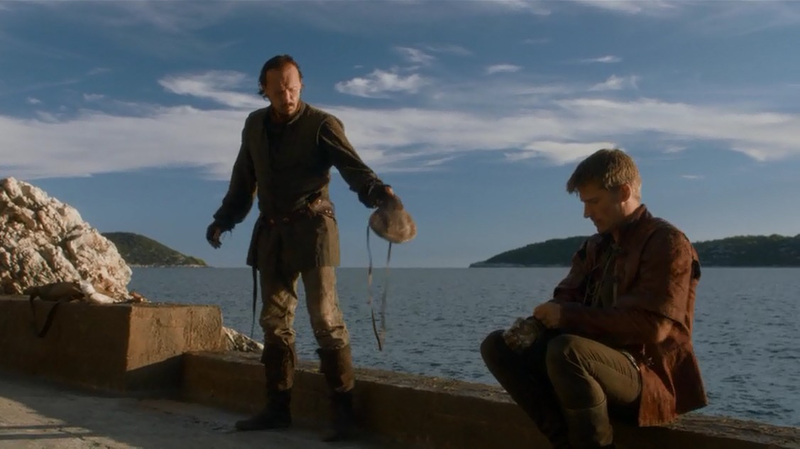 En Desembarco del Rey, Bronn y Jaime están entrenando para que el segundo recupere su destreza, y Bronn le pregunta a Jaime por qué no ha ido a ver a su hermano todavía. La culpabilidad hace que al final Jaime quede convencido. Bastante interesante la escena, por los personajes y los diálogos.