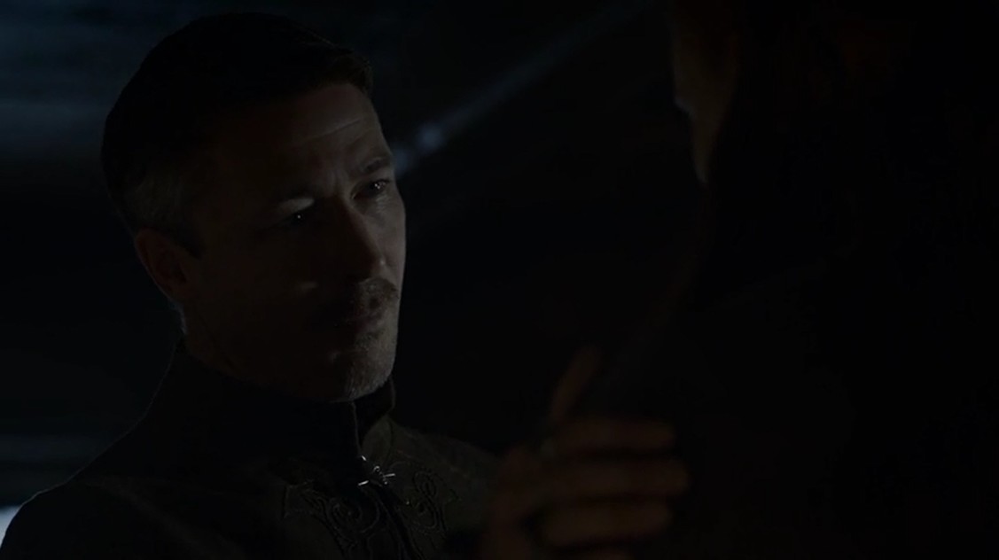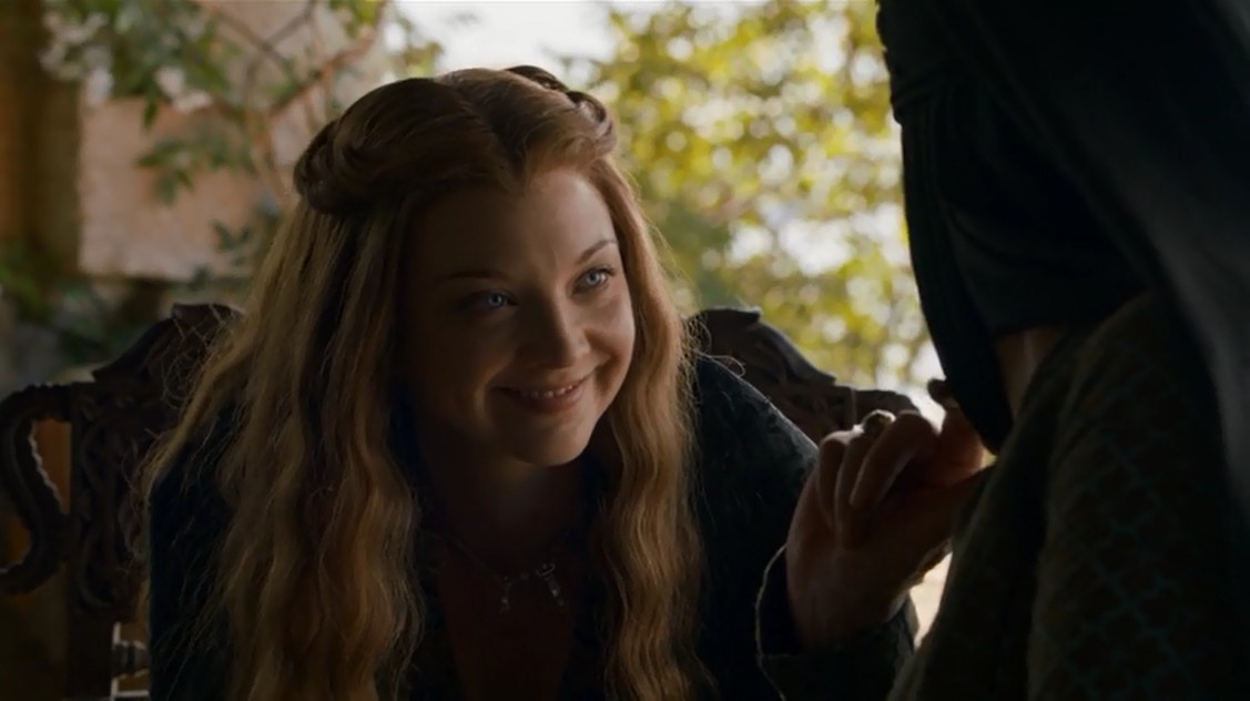 El plano con Olenna y Margaery se funde tendenciosamente con las últimas palabras de Meñique, y con razón. La nieta y la abuela hablan, Olenna cuenta alguna batallita de su juventud, y entre unas cosas y otras, le cuenta a su nieta que ella tuvo algo que ver con la muerte de Joffrey. Misterio resuelto, ya está confirmado 100% quienes fueron los asesinos. A Meñique ahora le interesa más la alianza con los Tyrell que la que ya tenía con los Lannister, y de ahí todo el tema del asesinato. La abuelita también le insinúa algunos pasos a seguir, y la nieta – lo veremos más adelante en el capítulo – sigue al pie de la letra sus veladas instrucciones.