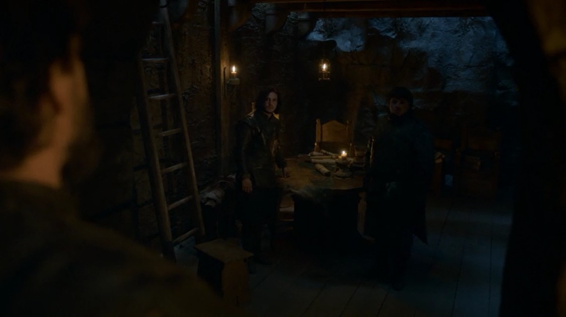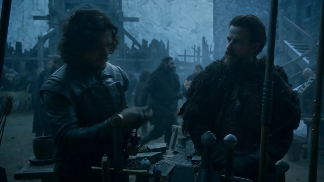 Vemos después de una escena de entrenamiento (en la que por cierto vemos al niño superviviente de la aldea arrasada del capítulo anterior), vemos una conversación entre la Cabra y Jon Nieve. Cuando Jon le pregunta qué hace ahí, Locke le cuenta que está ahí por su sentido del deber y se quiere unir a la Guardia de la Noche. Es mentira, todos lo sabemos, pero se quiere hacer amigo de Jon para conseguir llegar a Bran.