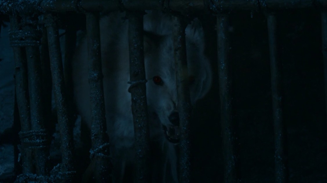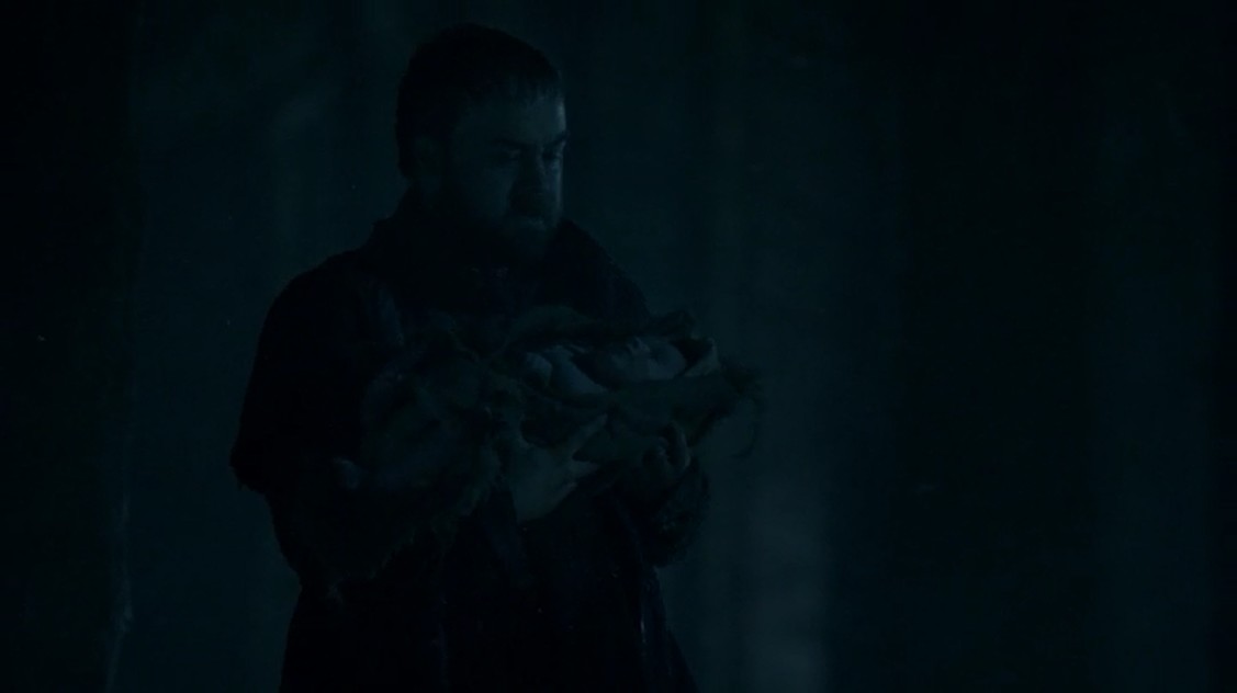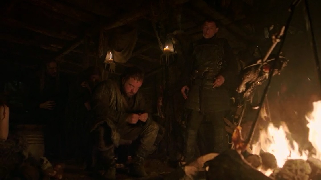 En la granja de Craster, el líder de los amotinados, Karl Tanner, Rast y los demás están pasándoselo bastante bien mientras consumen las provisiones y violan a todas sus hijas. Por lo visto, ¡últimamente en Poniente se lleva mucho eso de violar a diestro y siniestro a todo el mundo! Esto es algo que no ha gustado demasiado a muchos espectadores, cansados de ver violaciones de forma tan constante en la serie, al menos últimamente… Les interrumpe una mujer con un bebé en brazos, y es entonces cuando le cuentan a Karl que Craster le entregaba los niños varones a los dioses. Así que decide continuar con la tradición, pero envía a Rast fuera. Por cierto que vemos a Fantasma encerrado, y cuando Rast decide burlarse de él pierde un tiempo precioso que debería haber empleado en volver a un lugar seguro. En apariencia. Luego veremos que en realidad no le ha ocurrido nada.