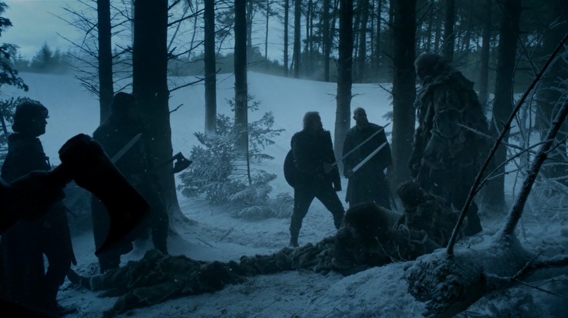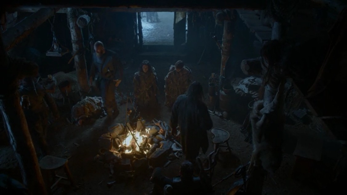 No lejos de allí, Bran y su grupo están alrededor de una fogata, cuando escuchan al bebé. A pesar de que parece peligroso hacerlo y Jojen intenta disuadirle, Bran se mete dentro de Verano para explorar el origen del llanto. Mientras lo hace, el huargo cae en una trampa y así se enteran de que tienen capturado a Fantasma. Cuando a la mañana siguiente van a ver qué hay allí, descubren que hay antiguos miembros de la Guardia de la Noche, y antes de hacer lo correcto e irse por donde han venido, les descubren y los mantienen prisioneros. Los amotinados pegan y torturan a Hodor (no le tengo aprecio al personaje pero tampoco me ha gustado ver cómo le pegan y no entiende nada). Tras un breve interrogatorio, Karl les sonsaca y descubre que tiene en su poder a Brandon Stark. Otro cambio con respecto a los libros, que puede tener consecuencias interesantes.