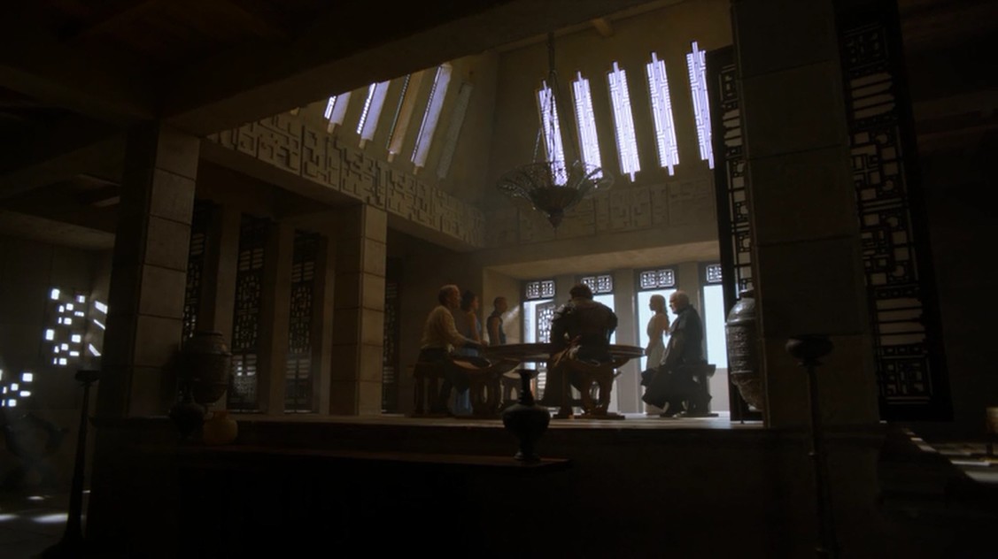 Cuando los dos se quedan solos, a Dany le asaltan las inseguridades, porque, si es incapaz de controlar la Bahía de los Esclavos, ¿por qué va a considerarle nadie una reina? Además, Jorah le cuenta que Yunkai han vuelto a dominarla los esclavistas, y que Astapor está dominada por un matón llamado Cleon. Así que él le aconseja solucionar sus problemas inmediatos, y así ella decide quedarse a reinar en Meereen.