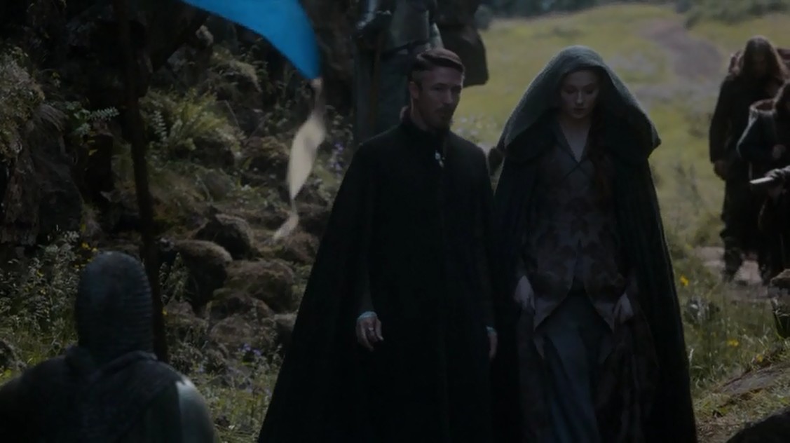Así que para presionarle, le recuerda todo lo que ha hecho a lo largo de los años por él. Echar gotas en el vino de su marido muerto (y por ello murió envenenado), escribir a Catelyn que los Lannister lo habían asesinado. Meñique accede a casarse esa noche, cuando encuentre un Septón que oficie la ceremonia. Pero ella ya tenía todo previsto, porque al otro lado de la puerta hay uno esperando. Advierte que va a gritar mucho cuando ella y Petyr tengan su noche de bodas.