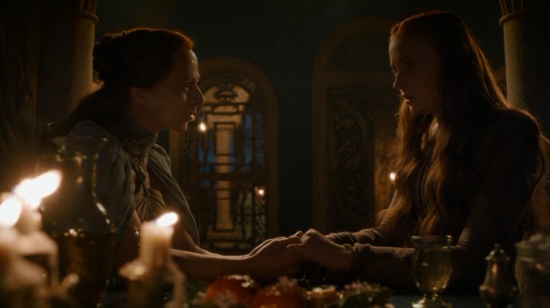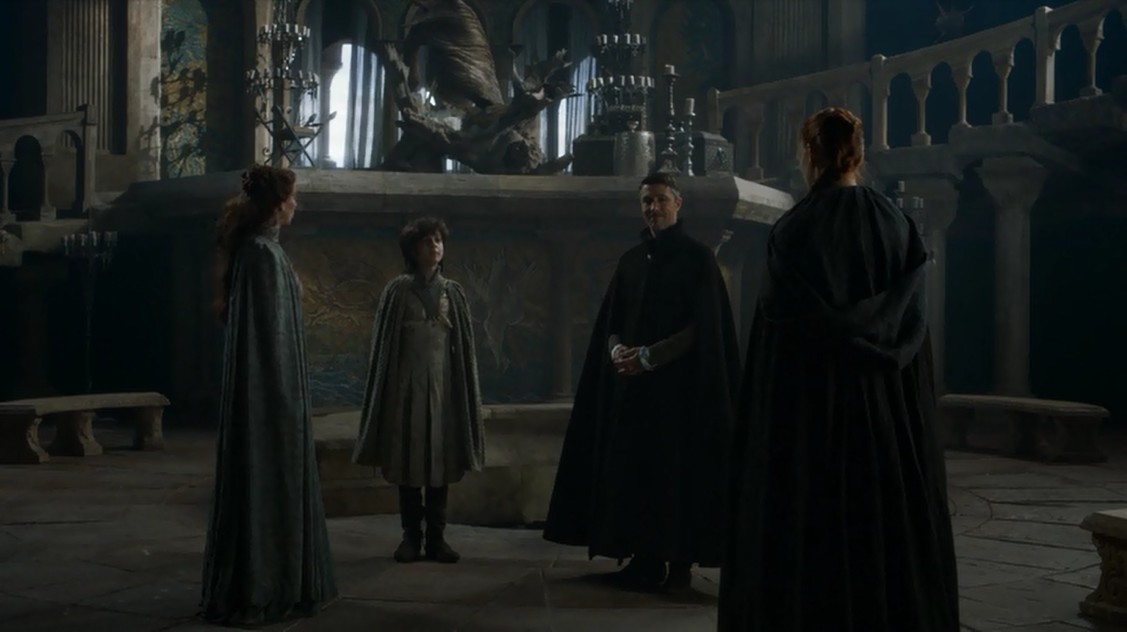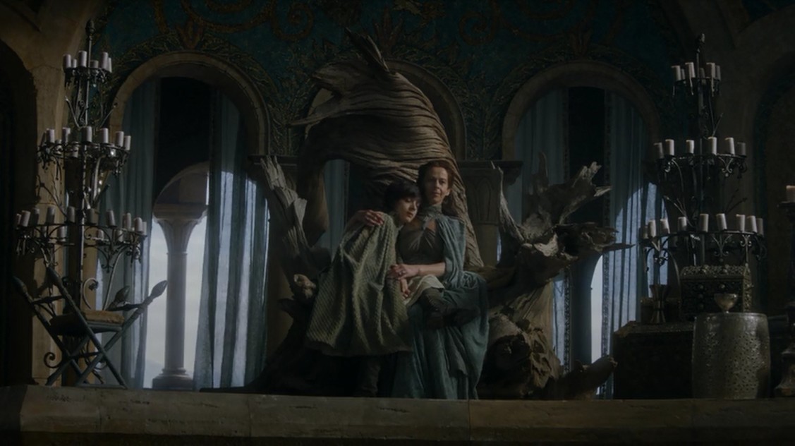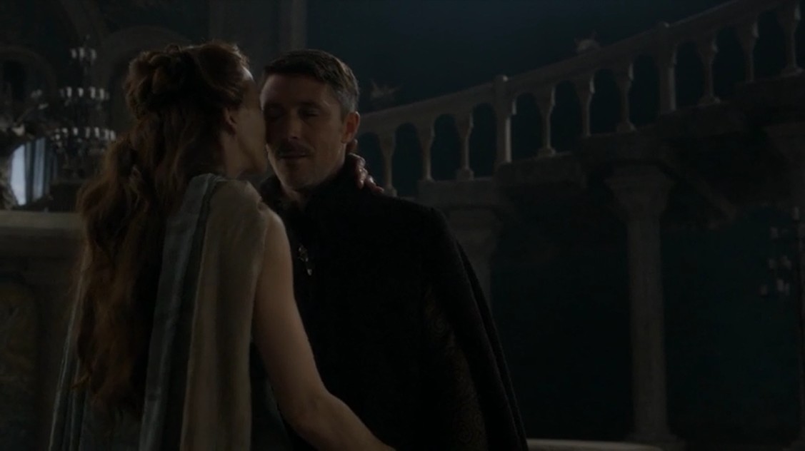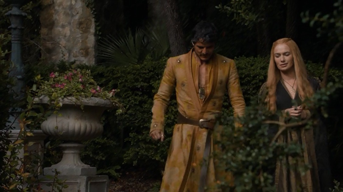 Después de la ceremonia, Cersei va a hablar con Margaery. Uno podría pensar que Cersei está de algún modo celosa de la mucha presencia que ha tenido la Tyrell últimamente en su vida y en la de sus hijos, pero el tono es sorprendentemente conciliador. En la conversación, obviamente, sale el tema de Joffrey (ya que Margaery todavía guarda luto por él), y Cersei reconoce que Joffrey hubiera sido su pesadilla. Es más, dice que algunas de las cosas que hacía su hijo la asustaba, pero que, aún así, uno siempre ama a su primer hijo más que a nadie. Después canta las alabanzas de Tommen, diciendo que posiblemente el primer rey decente en mucho tiempo. Todo esto para llegar a la conclusión – y a lo que realmente quería decir – de que Tommen necesitará ayuda para reinar (=una esposa Tyrell).