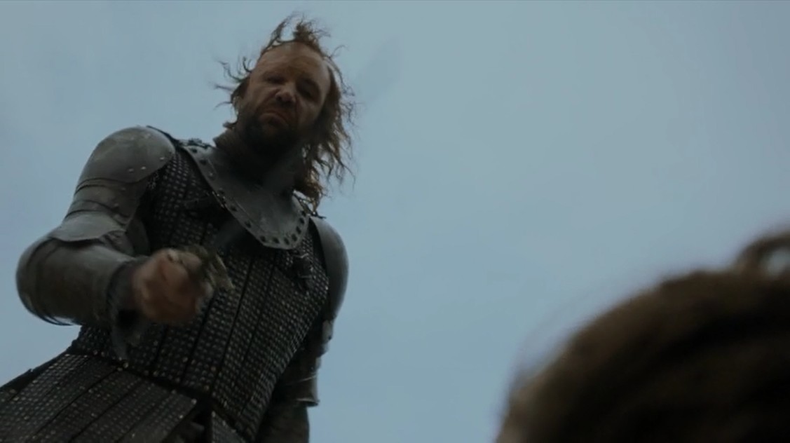 Cuando el Perro se despierta, encuentra a Arya practicando su danza del agua. Critica su técnica y a su profesor, que ella le cuenta que era Syrio Forrell. Cuando se entera de que Syrio murió a manos de Merryn Trant, se burla mucho tanto de Syrio como de Arya, que lo admira todavía. Y se burla tanto que Arya le clava la espada, o lo intenta. La armadura de Sandor detiene la pequeña espada de Arya.